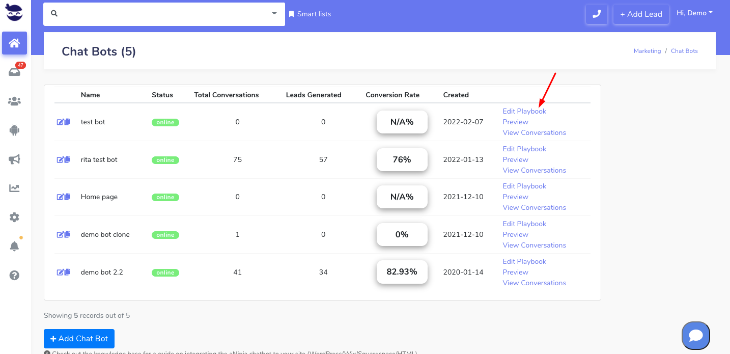 - On the right side next to the chatbot name, click on Edit Playbook.
