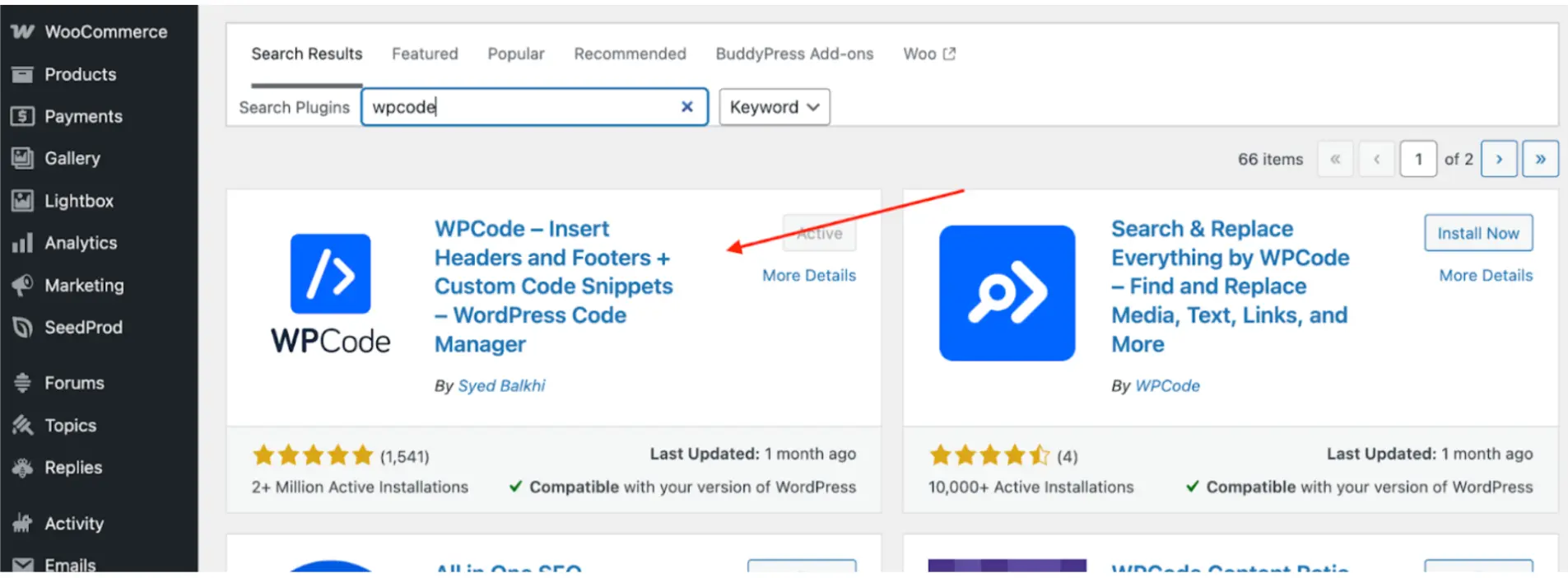 - In the top-right search bar, type: WPCode.