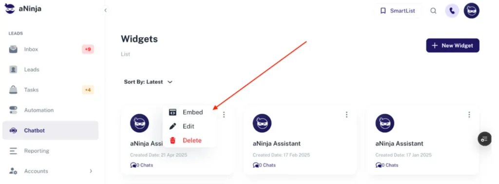 - Go to the Chatbot tab in your aNinja account.